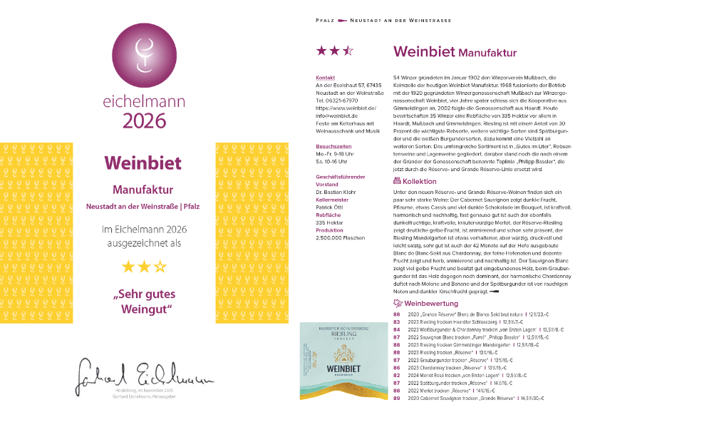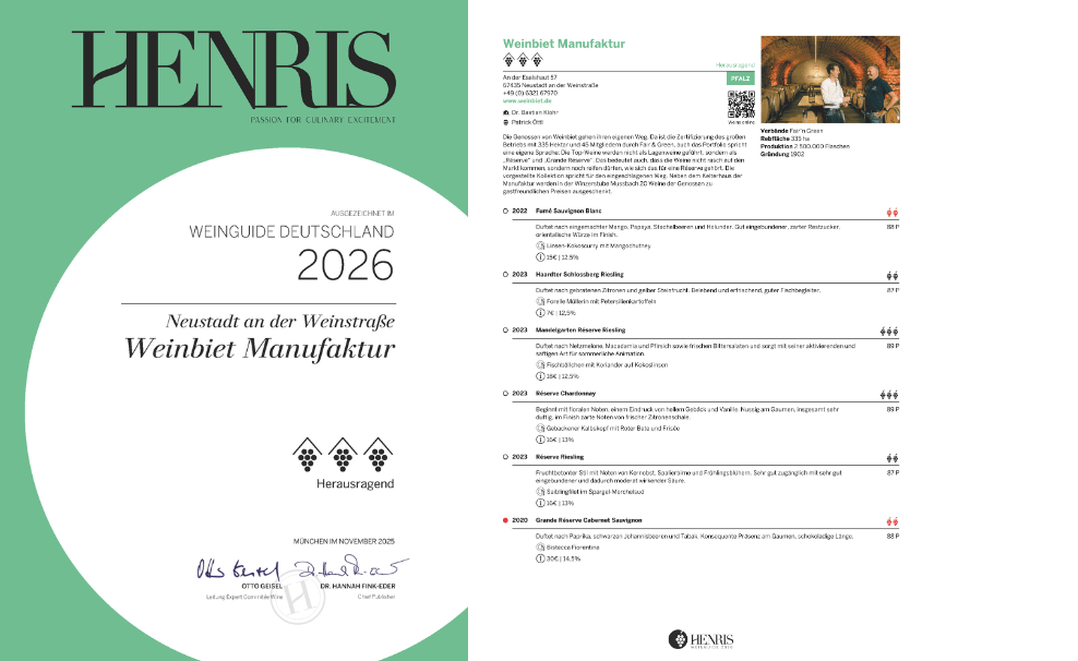 Nachhaltig in die Zukunft – zertifiziert nach FAIR’N GREEN leben 35 Winzer eine nachhaltige Gemeinschaft im Herzen der Pfalz. In unserer Weinbiet Manufaktur treffen Erfahrung auf Dynamik, jung auf alt und Handwerk auf Technik. Unterschiedliche Charaktere, verbunden durch einen Anspruch: Weine zu schaffen, die Spaß machen und unsere individuelle Handschrift tragen.